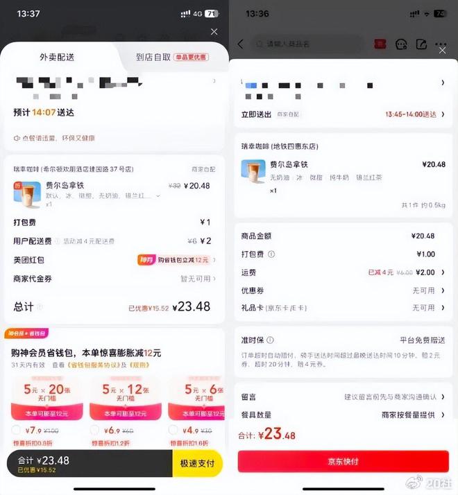 但我们测试发现,京东已经开始努力比价。我在京东上点了一单瑞幸的费尔岛拿铁,各种优惠券减免下来的价格是23.48元;而在同一时刻,点开美团同一家店下同一单商品,报价也是23.48元,精确到分。