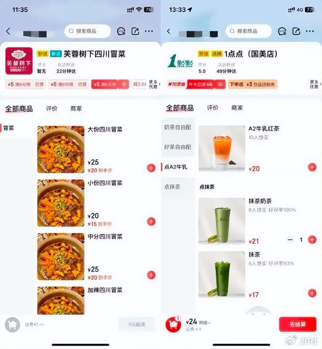 优惠券的应用范围也有些尴尬。部分餐饮商家有满6减5券,但本身价格就比较贵,除了醉面以外,基本点一单也要三四十,优惠感受不深。对于没有优惠券的商家,消费者还需要付3-6元不等的配送费。