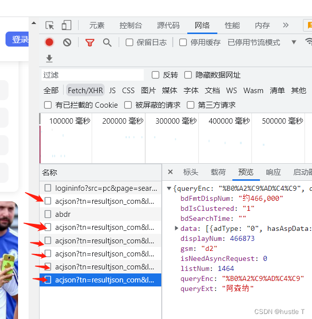 所以基本判断百度图片的网页是一个动态网页。这种与数据库不断交互的动态网页。我们在页面源代码中是拿不到照片地址的,或者说可能有20张的图吧(在有些网站中)。而静态网页是基本上全部内容我们在页面源代码都可以找到。所以第一部分的思路分析完成即我们针对动态网页进行爬取。 思路第二部分(代码实现爬取图片):首先打开浏览器的开发者工具(F12),然后锁定network(网络),再锁定fetch/xhr后。json中,就藏着一个个图像的相关信息。上图吧!