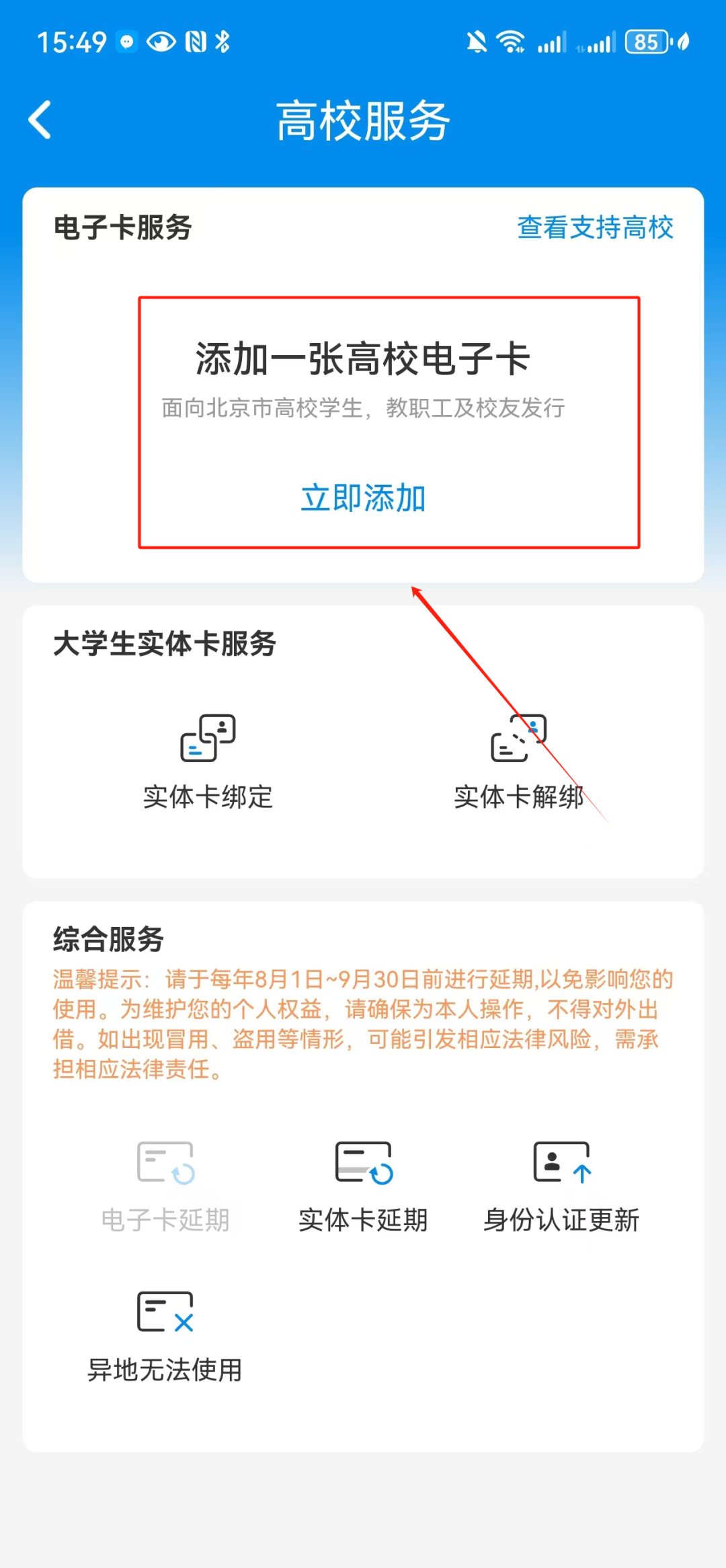 进入“高校服务”栏目选择“添加一张高校电子卡”,点击“立即添加”;