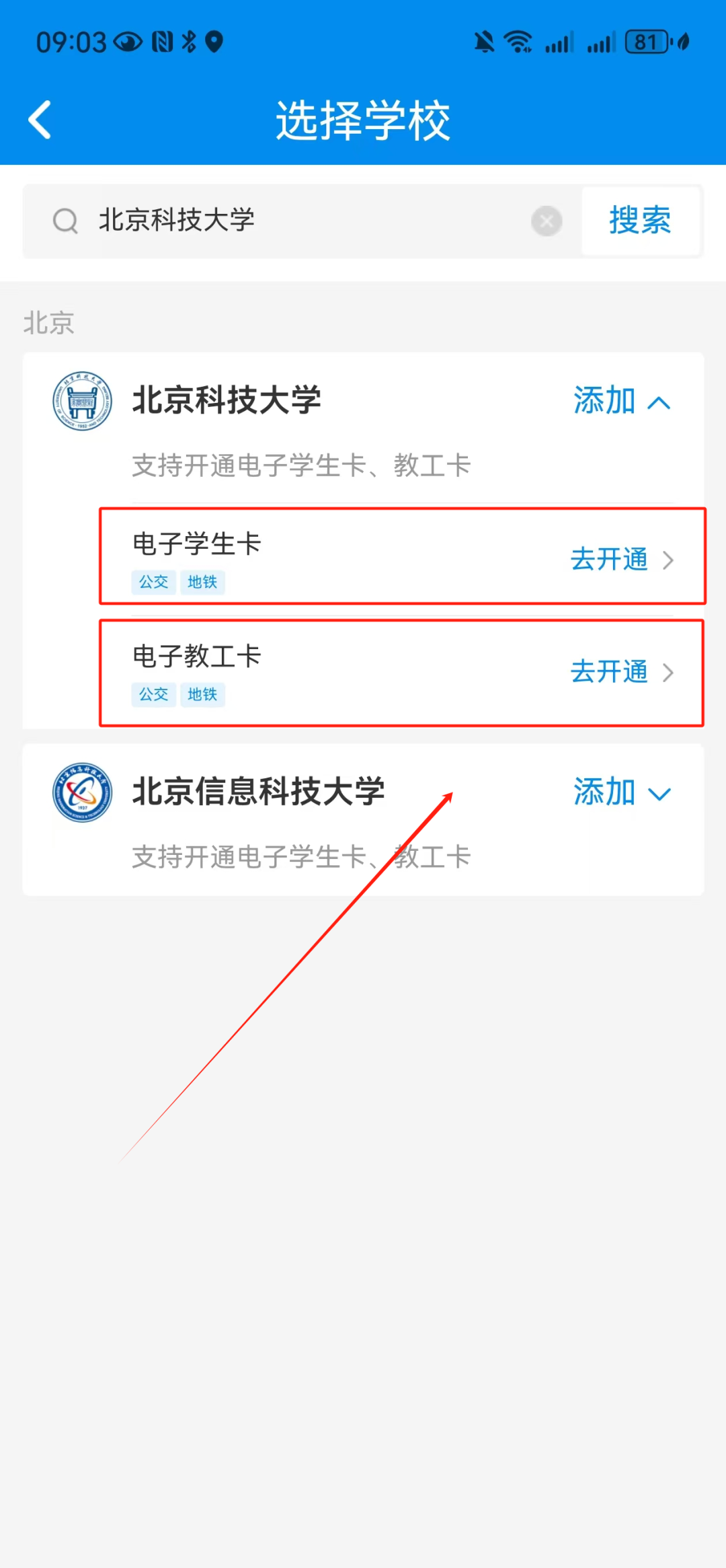 阅读开通步骤后点击“去开通”,找到“北京科技大学”并选择“电子学生/教工卡”;