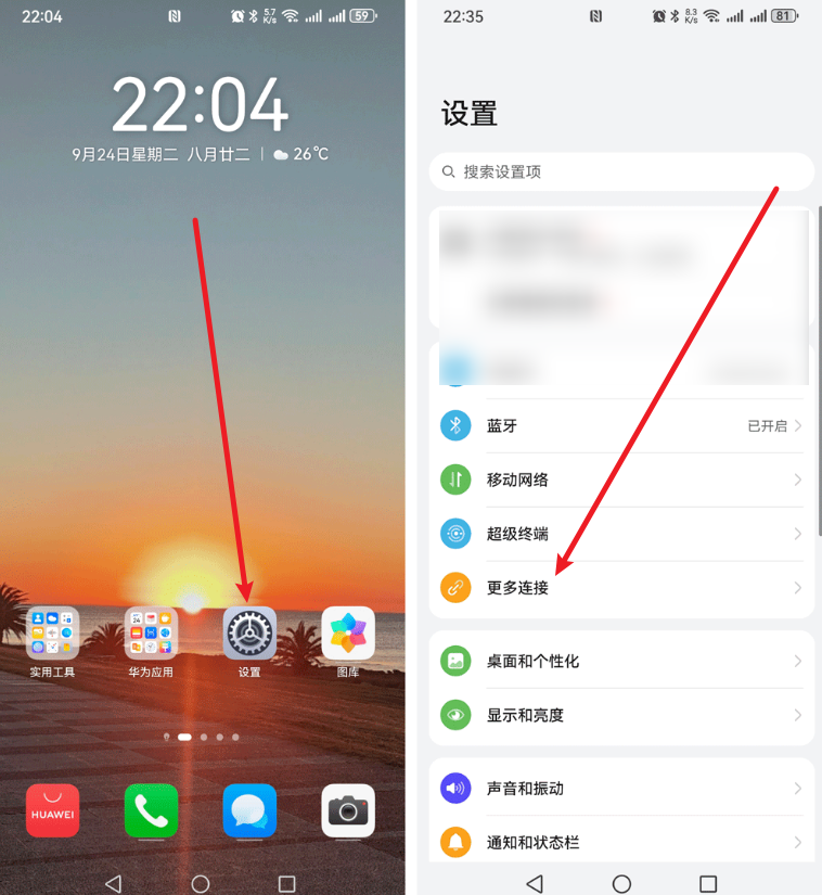 1、在手机桌面上找到并点击【设置】,进入“设置”页面后再点击我们的【更多连接】选项;