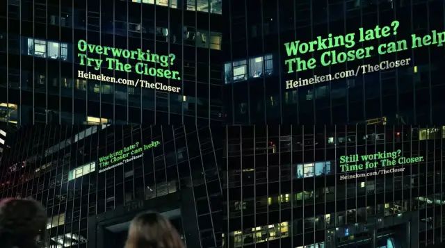 最近,喜力的工作人员走上不夜城纽约的街头,在晚上九点以后寻找高楼大厦之间还开着灯的办公室,用投影出来的户外广告提醒身在其中的加班打工人该下班了。如果下班很难——老板还没走、活还没干完,那就使用The Closer来强制下班吧。