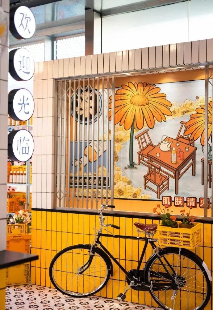 今年,有关于酷暑的天气话题不断,科颜氏和王老吉借势跨界联名,携手推出了一场名为“今日大吉”的活动,在广州永庆坊内开了一家快闪店,打造限时“金盏花凉茶铺”,呈现视觉与产品融合的清凉打卡点。整个店铺呈现国潮风的设计,店铺在入口处设置了巨型金盏花喷泉,室内不论是环境装潢亦或是元素装点,都趋近于老广茶室的feeling。