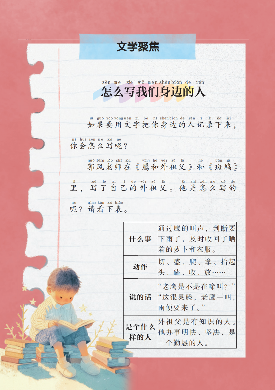 真正的写作,是从心出发的对话。《明亮的文学课》还设置了“文学聚焦”的助读模块,帮助孩子真正走进文本,引导孩子对文本、文体等进行探究,教会孩子们如何在阅读中思考,在观察中感悟,将个人的情感、见解融入文字之中。