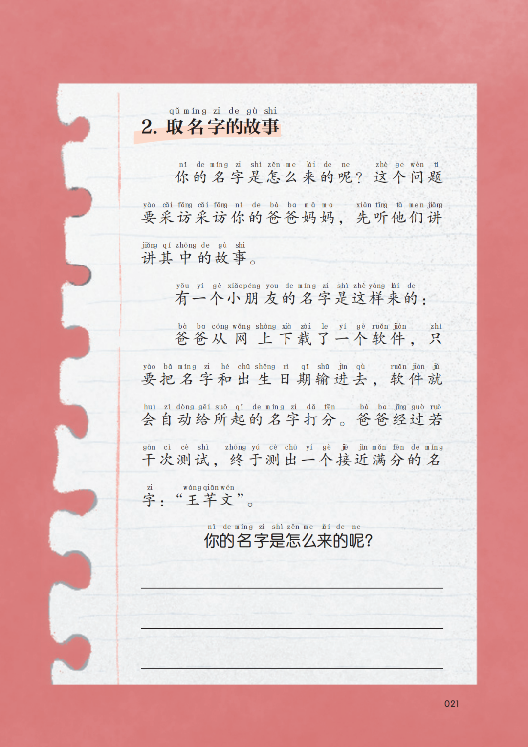 像一年级的的孩子虽然没有习作课,但可以学着写一些小片段,比如“说一说我的名字”, 读写建议就通过引导孩子从名字的意思到取名的故事,丰富写作的内容。