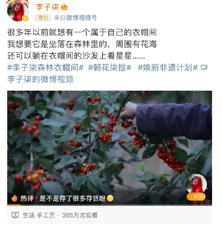 首条视频发出半小时,李子柒又发布了一则将柴房改造成“森林衣帽间”的视频。鲜花作伴,绿地为依,星辰闪烁间,她又用巧手为自己打造了一个小小的“童话世界”。