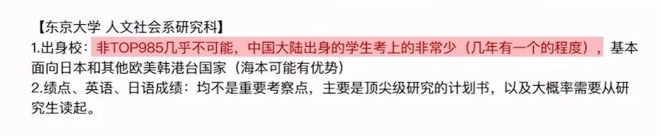 但事实上还是有一些潜规则在的:比如说人文社会系研究科,非TOP985几乎不可能能考得上,中国大陆出身的学生几年才有一个考上;