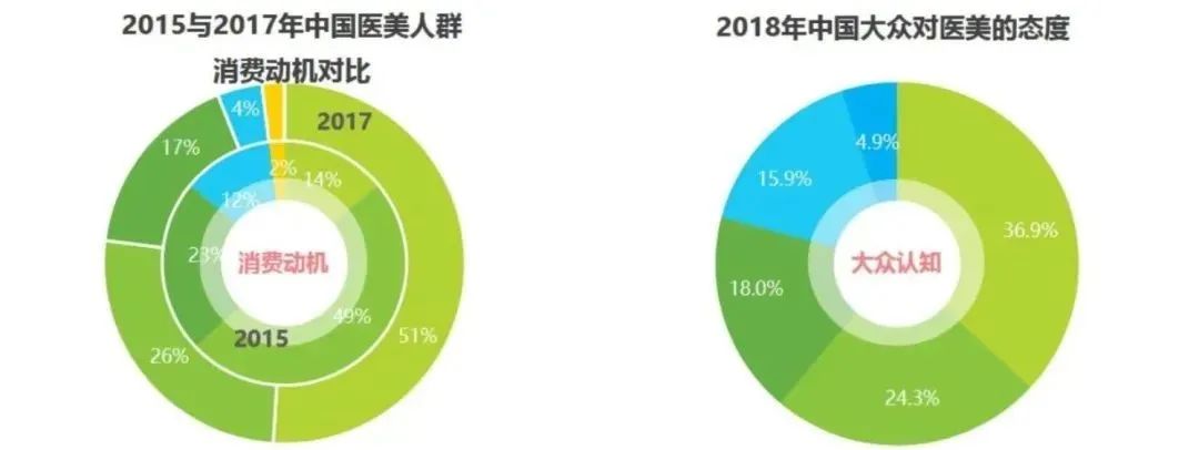 中国中青年群体由于社会关系、工作强度、家庭负担、子女教育等方面的压力,以及不良的行为生活习惯,导致对自身的健康状况重视不足,以至于慢性病在中青年群体中逐年增加。有调查显示30-50岁人群中“三高”问题都处于较高水平。是个人都爱美,无论男女。整形美容虽颇受争议,在很长一段时间内都不被大众接受。但医美市场的快速增长,是源自民众观念的改变。据新氧大数据调研,2018年中国大众对医美持正面态度,其中36.9%的人愿意微调,24.3%的人持欣赏态度,认为这是勇敢的选择,4.9%的人愿意尝试手术类项目。同时,相比2015年,消费者对医美的态度也更加轻松,51%的医美人群表示做医美是为了取悦自己。
