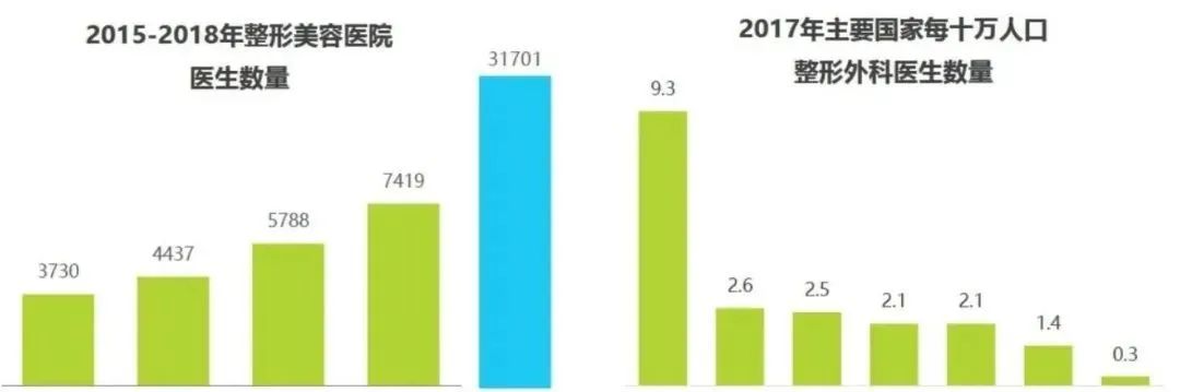 据统计年鉴显示,2018年我国整形医院与美容医院医生约7419位(包括整形外科、皮肤科、中医科、口腔科部分医生),与新氧2018年底记录的31701位差距较大,其差距主要来自医美门诊部、诊所、口腔机构及生活美容等领域。然而,与医美发展相对成熟的国家对比,我国人均整形外科医生数量远远不足。同时,培养一位优秀医美医生需要10年左右的时间(5年本科,3年硕士/3年博士,3年住院医生/专科培训后,还需各地卫生部批准主诊医师资格证)。因此,在医美需求旺盛的今天,催生了大量无证人员非法上岗,引发行业乱象。