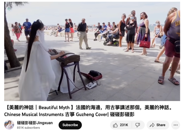 在法国街头弹奏古筝的音乐类视频创作者彭静旋,已经在YouTube拥有近百万粉丝,在她演奏《神话》的视频下面有外国网友评论称,这首曲子让他联想到了一对樱花树下的情侣,但唯美爱情的结尾却以悲剧结束。