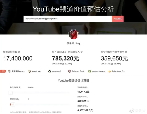 这张截图来自于一个YouTube频道价值预估分析平台,其显示虽然李子柒已停更一年多时间,但她的YouTube频道粉丝数仍高达1740万,上传的共128条视频总播放量多达29.2亿次,并且由视频播放量带来的月均广告收益约78.5万元。