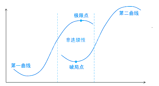 这是两条S型曲线,第二曲线最开始的拓展阶段,需要大量的资源投入。在第一曲线达到顶点之前行动,企业有足够的资源、有相应的人力、财力和物力,去弥补企业在第二曲线投入初期的消耗。如果过了第一曲线极限点后才开始,那时第一曲线的整个市场已经在下降,这时对第二曲线进行大投入,企业的压力会很大。