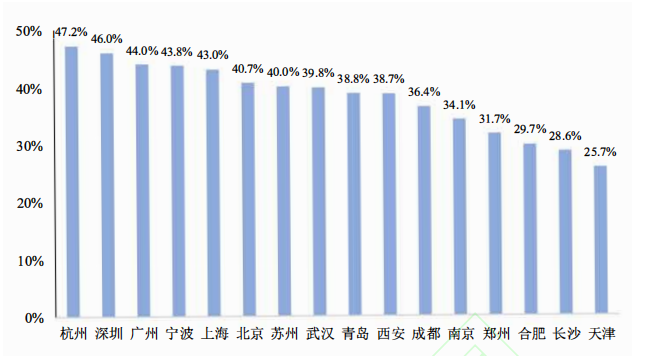 笔者进一步探究北京、上海、广州等16个一线城市的中小企业数字化转型情况。有数据显示,有7个一线城市的中小企业数字化转型比例突破40%,包括杭州、深圳、广州、宁波、上海、北京和苏州。其中,杭州、深圳、广州的中小企业数字化转型比例位居前列,分别为47.2%、46.0%、44.0%。合肥、长沙和天津的中小企业数字化转型比例相对较低,分别为29.7%、28.6%、25.7%。