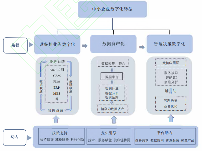中小企业在借助“外力”扶持的同时,应增强转型“内力”,结合自身特点、发展方向及市场需求规划企业转型路径:在转型的初创探索期可偏重系统线上化和业务数字化,长期发展需从数据的联通整合转向数据的深入应用,深度挖掘数据价值,应用数据辅助企业战略决策和业务优化,实现智能生产。