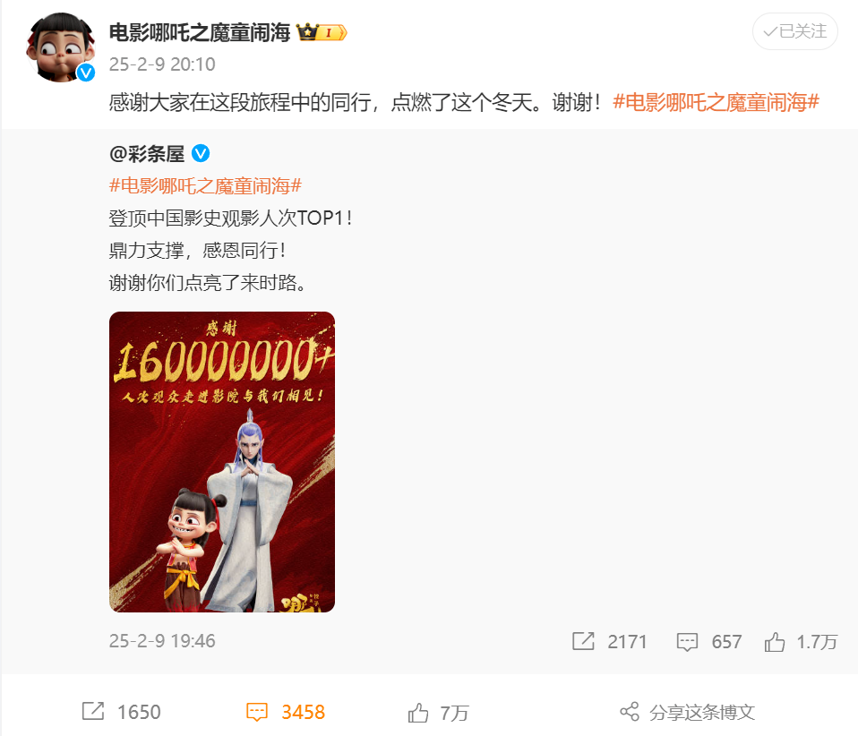 截至2月9日19时21分,《哪吒2》观影人数累计达1.6亿人次,打破了由《战狼2》保持的中国影史累计观影人次纪录,用时11天13时21分。接着,官方微博配发海报,感谢160000000位观众。