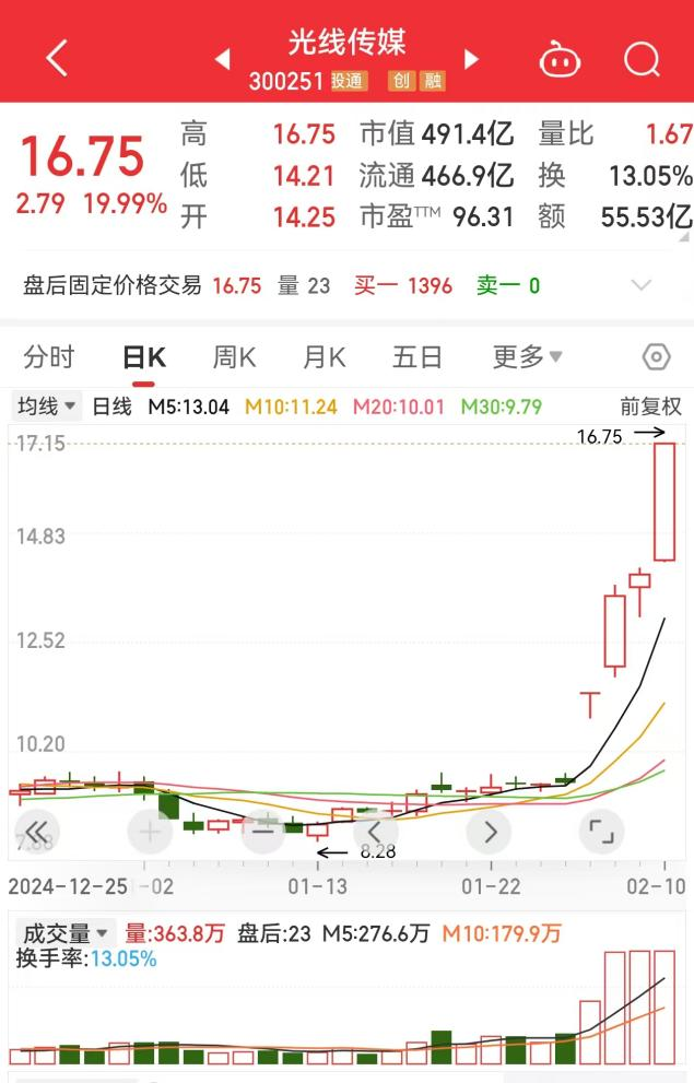 资本市场更是被《哪吒2》搅翻天。2月5日,光线传媒股价20%涨停后,2月10日又20%涨停收盘,开年四个交易日累计涨超75%,市值增长超200亿元,总市值直奔500亿。