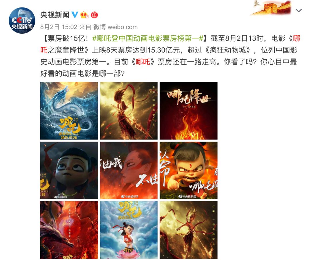 这个暑期档,一部国产动画电影《哪吒》席卷院线,以势不可当的姿态刷新影迷对国产动画电影的认知。上映仅8天,《哪吒》累计票房达15.28亿,打破了迪士尼出品的《疯狂动物城》保持3年的榜首记录,成为内地市场动画电影票房榜冠军。昨天(3日),《哪吒》总票房已突破20亿元。