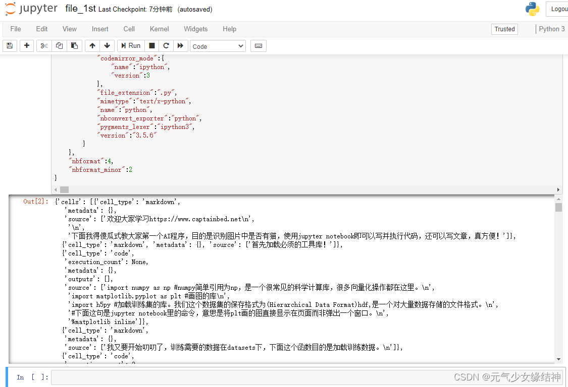 运行"execution_count":null,时报错:NameError: name 'null' is not defined 为什么我安装的是和老师一样的版本Anaconda3-5.1.0,还会报这个错。然后我将null换成了None,再点击Run,出现下图结果。这是没问题了吗?这个输出就是把上面红色编辑内容打印一遍一样?也再没任何报错。可是这不应该啊
