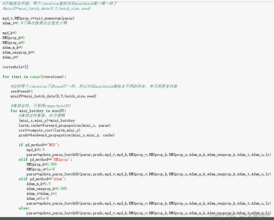 这个实例是使用mini-batch与梯度下降的几种优化方式结合起来,对比效果。老师只写了随机GD、MGD、Adam GD,我还将课程里学的RMSprop GD一起写了进去。