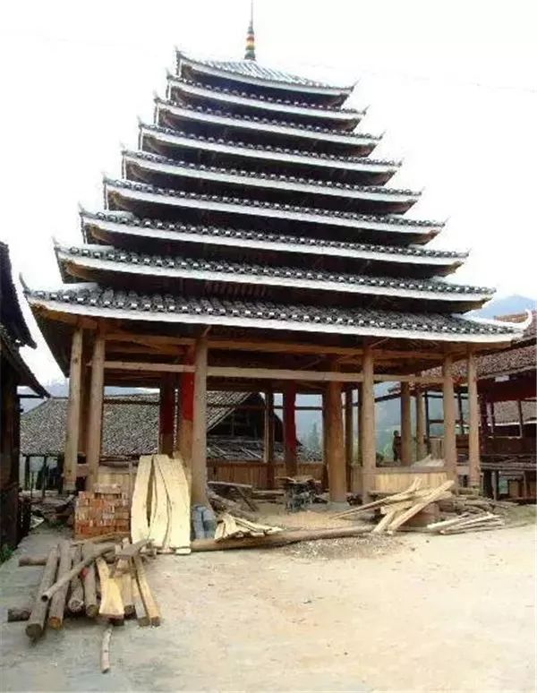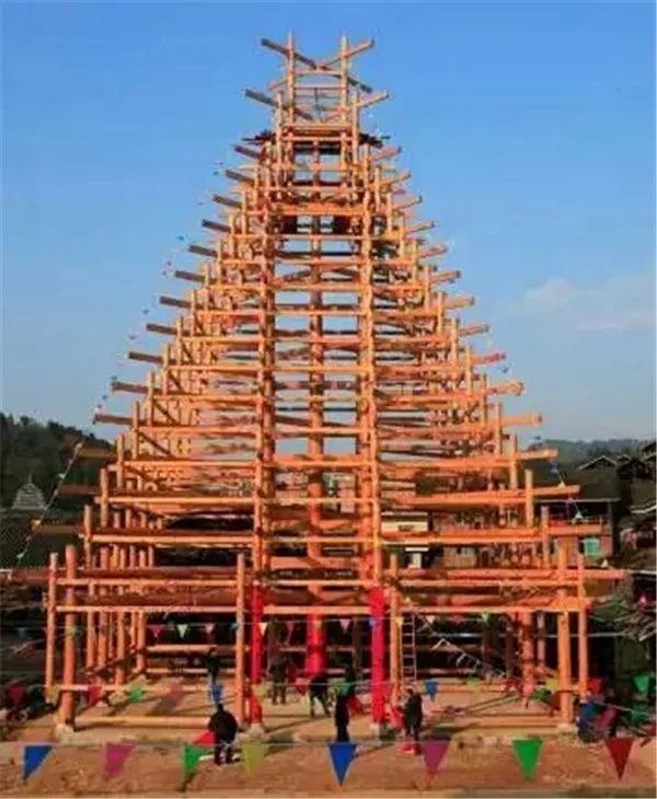 对呀。之前研究了类似鼓楼的构造,然后自己设计,做了一些改进。因为平懂这个鼓楼主要是用来当作舞台的,我是采取从里面吊柱的方式,把五根柱子拉开。刚开始做的时候也很难,非常担心做不成。还好,功夫不负有心人,上梁那天还是很顺利。我的第一栋九层高的鼓楼就这样诞生了,当时在整个程阳八寨引起了一阵轰动。