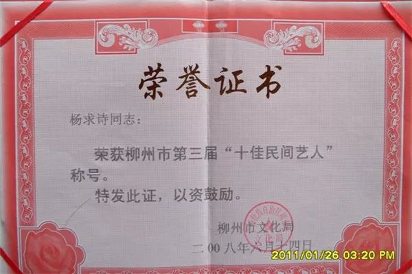 杨求诗获柳州市第三届“十佳民间艺人”称号