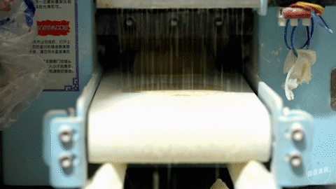 包饺子挺快,但是擀饺子皮可就没那么容易了。老板说他有绝招,瞅瞅这机器,一分钟就能压出上百个饺子皮,对后厨的大姐们来说也是一种解放。