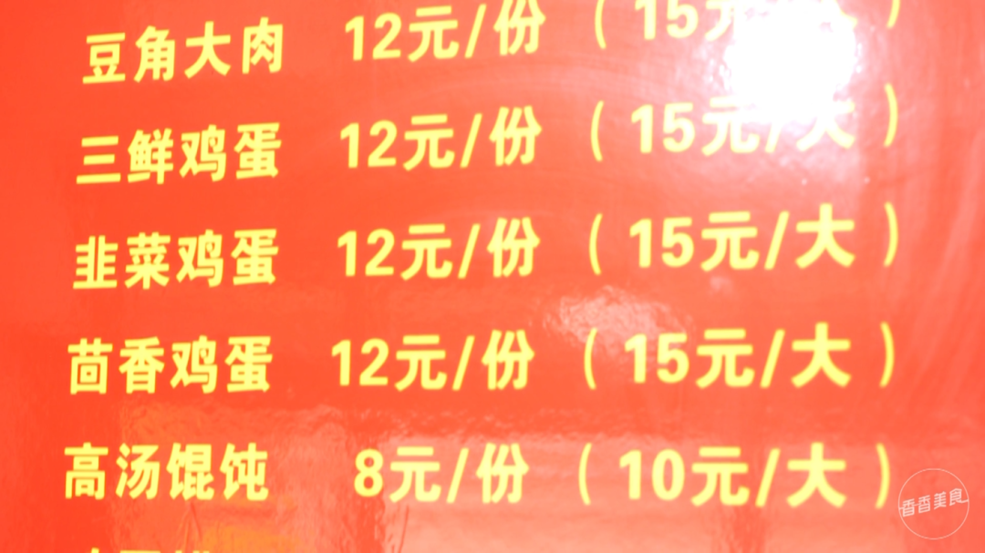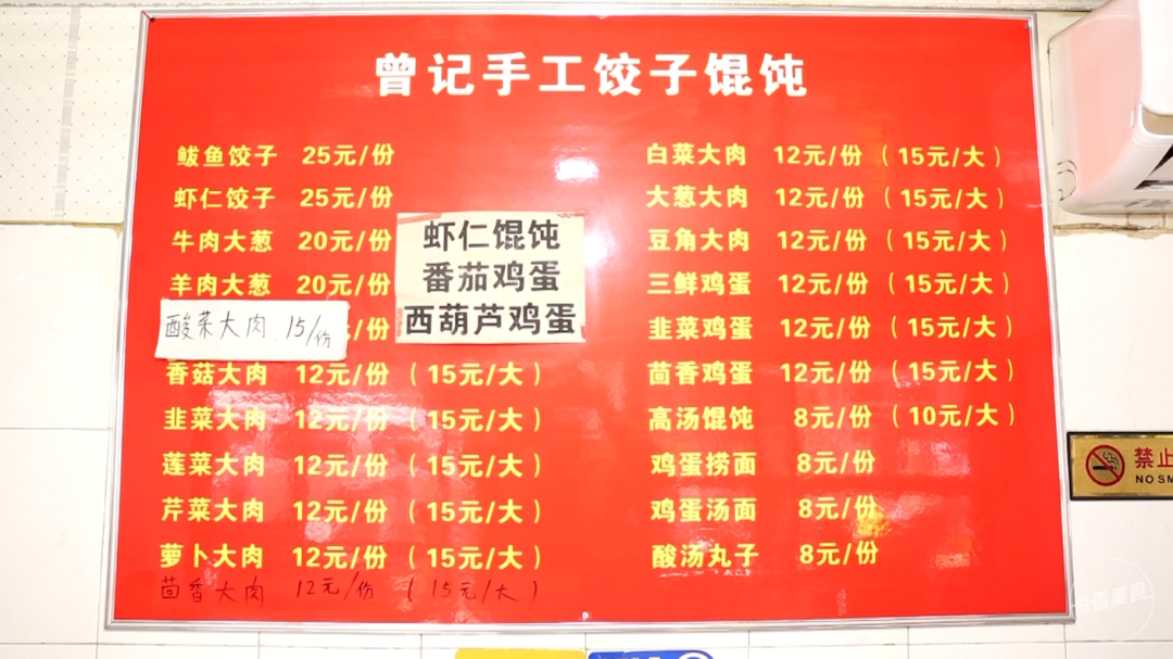 除了传统的韭菜大肉、萝卜大肉、芹菜大肉、韭菜鸡蛋外,店里还有鲅鱼饺子、番茄鸡蛋饺子等,算下来大概有23种。店员大姐告诉我们23种只是个大概数字,店里其实是按时令食材来做饺子的。这样更合大家的胃口,卖的也更好。除了饺子外,店里还提供馄饨、汤面和酸汤丸子。