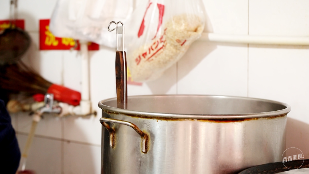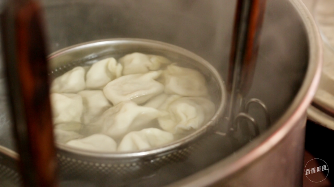看到这里,我们还有一个小疑问。每天这么多人来吃饺子,我们环顾一周发现店里只有一口锅,咋能同时煮出这么多饺子,而且清楚区分出不同馅料的饺子呢?往锅里一看我们瞬间明白,这很像煮热干面的面笼,但是网眼会更大,饺子放里面一煮很方便。