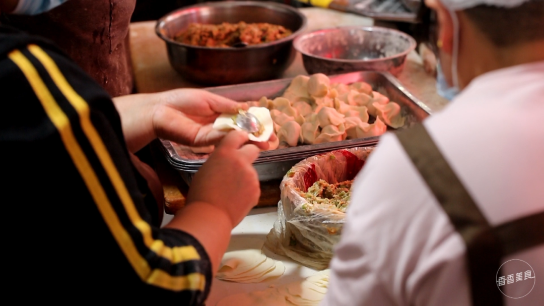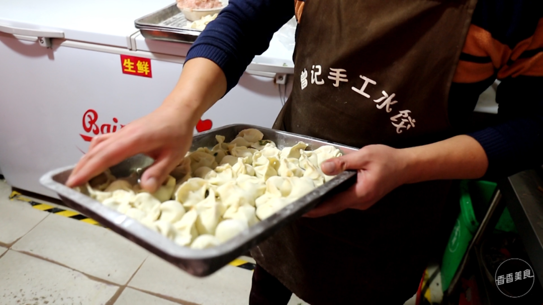 后厨几个大姐正在忙碌,填馅包饺子忙的不可开交,基本上两三秒就能包出一个饺子,这手速简直了……我们也做了一个统计,一托盘大概有五十个饺子,一会儿功夫墙角就堆了二十多个托盘,这样算下来一天卖出几万个饺子不成问题。